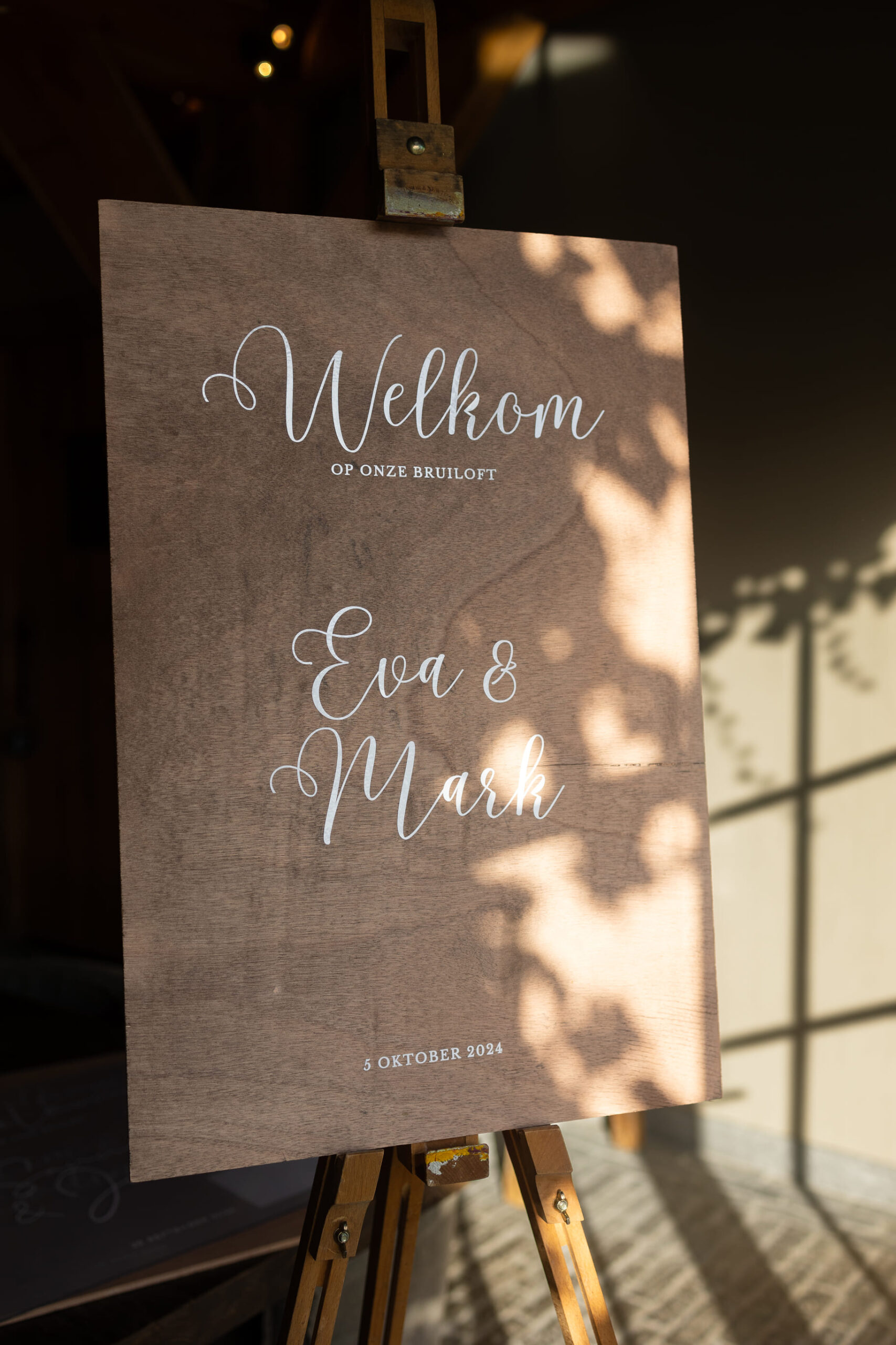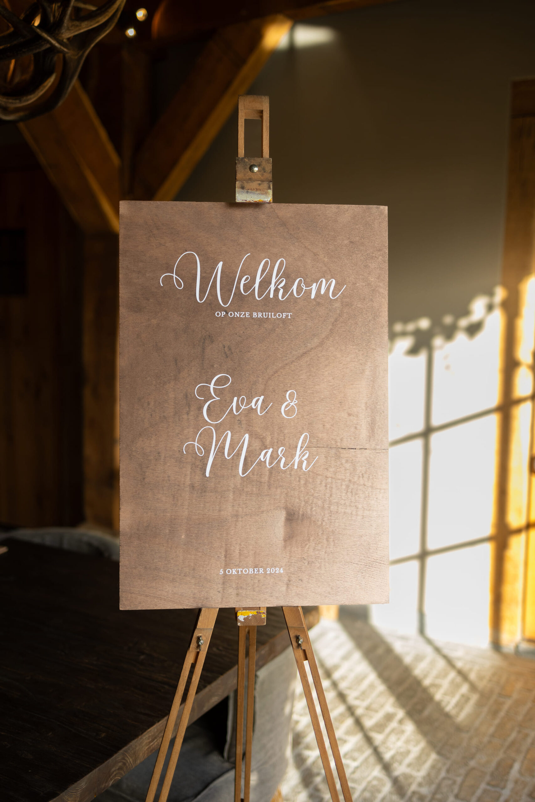 Geef een warm welkom aan je gasten met een stijlvol welkomstbord op een ezel. Kies uit verschillende materialen om perfect aan te sluiten bij de sfeer van je evenement: